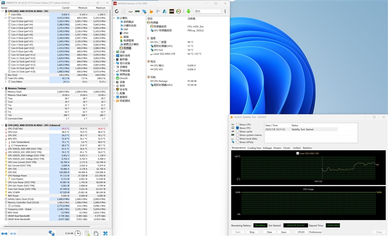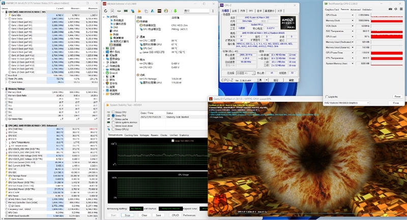 在CPU性能方面,Zen5处理器原本就拥有非常优秀的能效比,锐龙AI Max + 395的CPU核心在烤机7分钟的情况下可以稳定106W的性能释放。