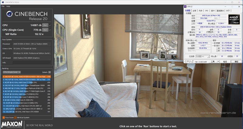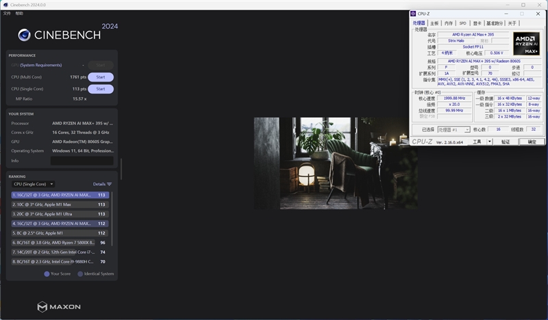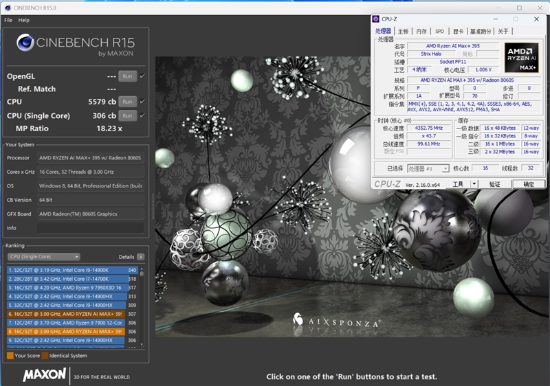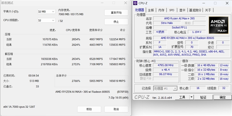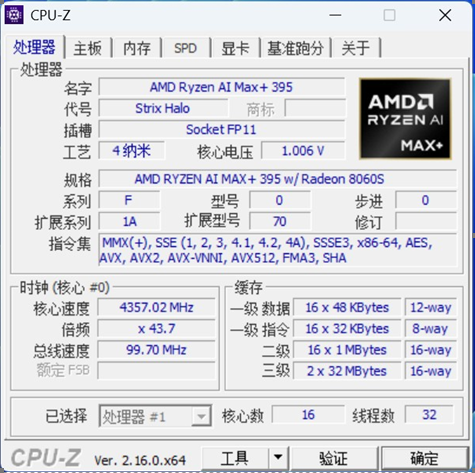 锐龙AI Max + 395的CPU部分包含16个超大Zen5核心,32线程,加速频率5.1GHz,拥有64MB三级缓存,以及16MB二级缓存。