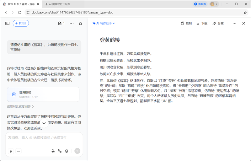这是同样的命题,让豆包写的一首《登黄鹤楼》,比起235B的Deepseek,高下立判。