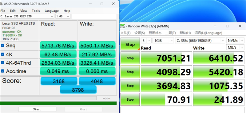 在AS SSD Benchmark中,这块2TB的PCIe 4.0 SSD的总分为8798,顺序读写超过5713MB/s、5050MB/s,4K随机读取62MB/s,随机写入217MB/s。