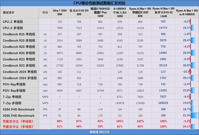 和100W的i9-14900HX/锐龙9 7945HX3D相比,多核性能有25%左右的优势,比起90W的Ultra 7 155H,领先幅度将近100%。
