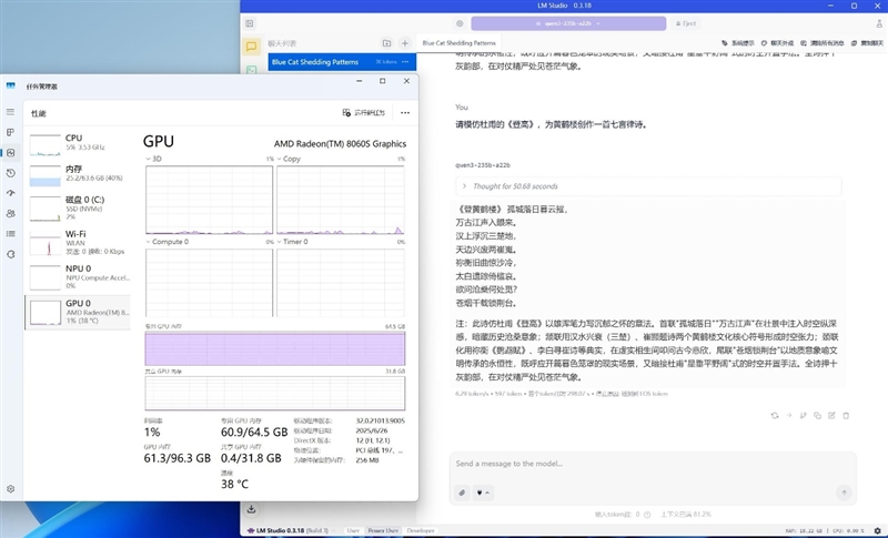 235B模型显存占用61GB,目前为止在消费级GPU仅有Radeon 8060S可以流畅运行,即便是RTX 5090,由于其显存只有32GB,强行加载235B模型会出现爆显存的情况,算力断崖式暴跌。