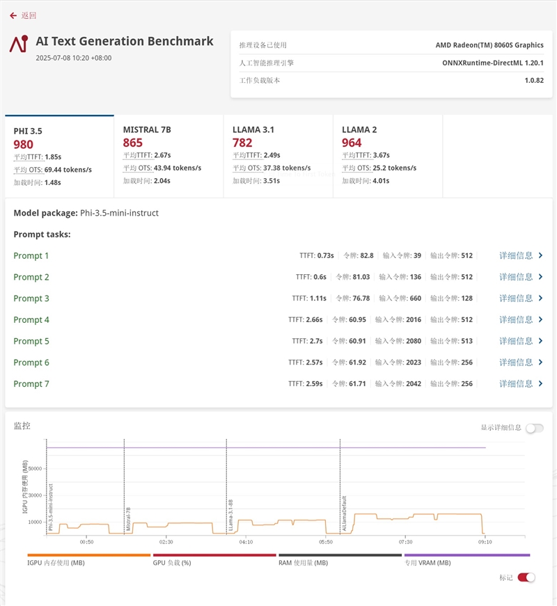 AI Text Generation Benchmark的测试,Radeon 8060S在LLAMA 2 13B的测试中,分数是RTX 5050的三倍。
