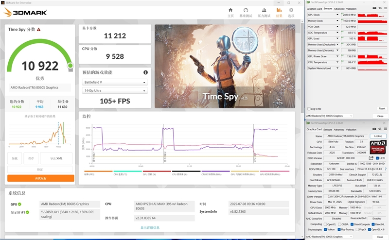 在2K分辨率3DMark Time Spy测试中,RADEON 8060S图形分数达到了11212分,核心运行最高频率为2810MHz,显卡最大功耗138W、最高温度83度。