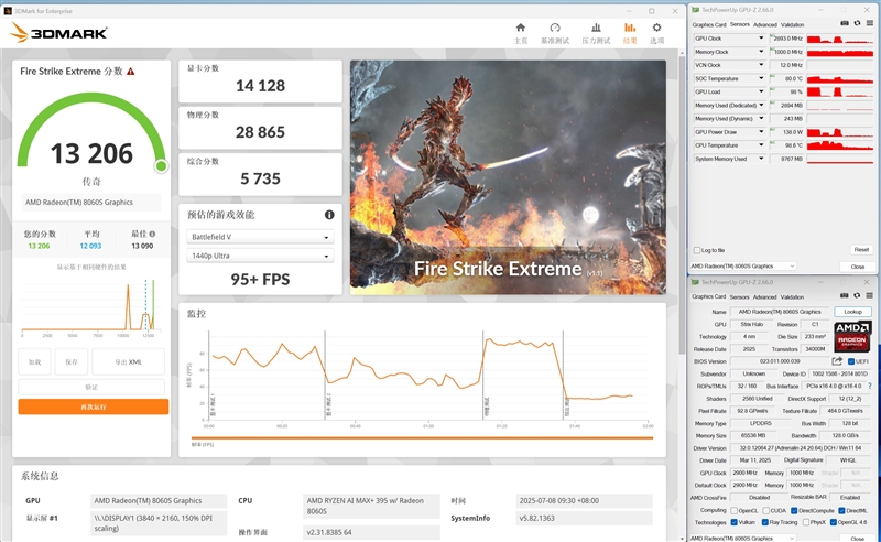 在3DMark Fire Strike Extreme测试中,RADEON 8060S图形分数为14128分,核心温度最高80℃,核心运行最高频率为2893MHz,显卡最大功耗138W。