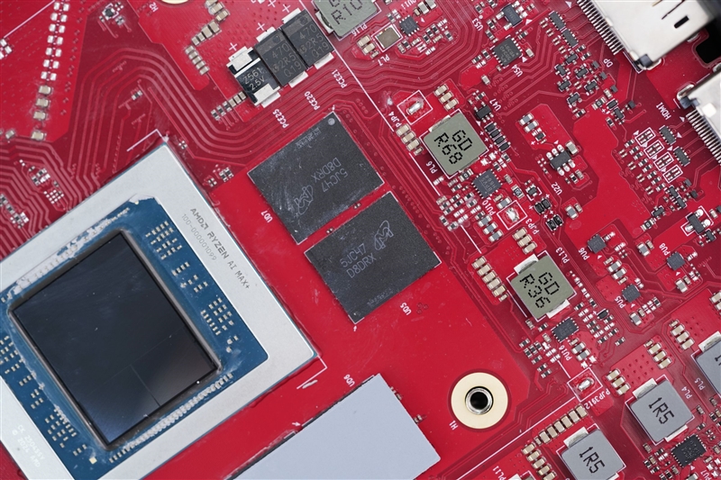 中间是锐龙AI MAX+ 395处理器,旁边是8颗美光LPDDR5X内存,总容量128GB。