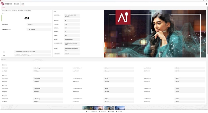 当Radeon 8060S使用FP16精度进行AI Image Generation Benchmark测试时,总分为674。